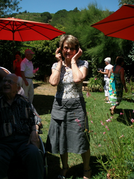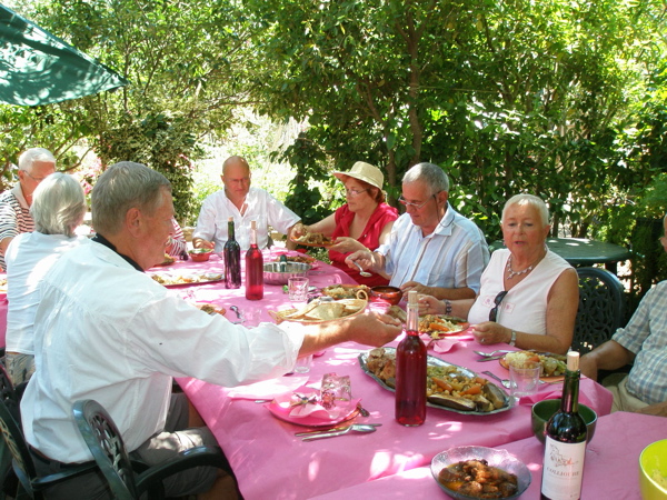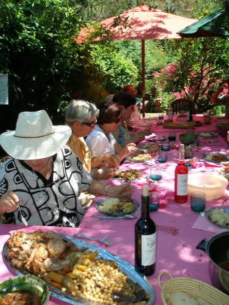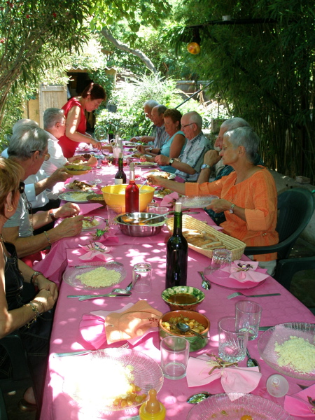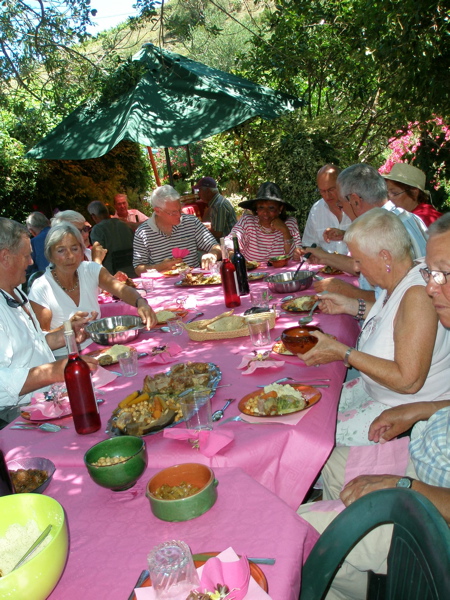 Les 73 convives ont pu profiter, dans un magnifique jardin ombragé, de l'hospitalité et de la gentillesse de la maîtresse de maison, Claude de la Comble. Sylvette Mauris, l'infatigable organisatrice de ce repas était au fourneau pour nous concocter à elle seule un excellent couscous suivit d'un dessert rafraîchissant poussé par les fabuleux mantécaos de Janine.