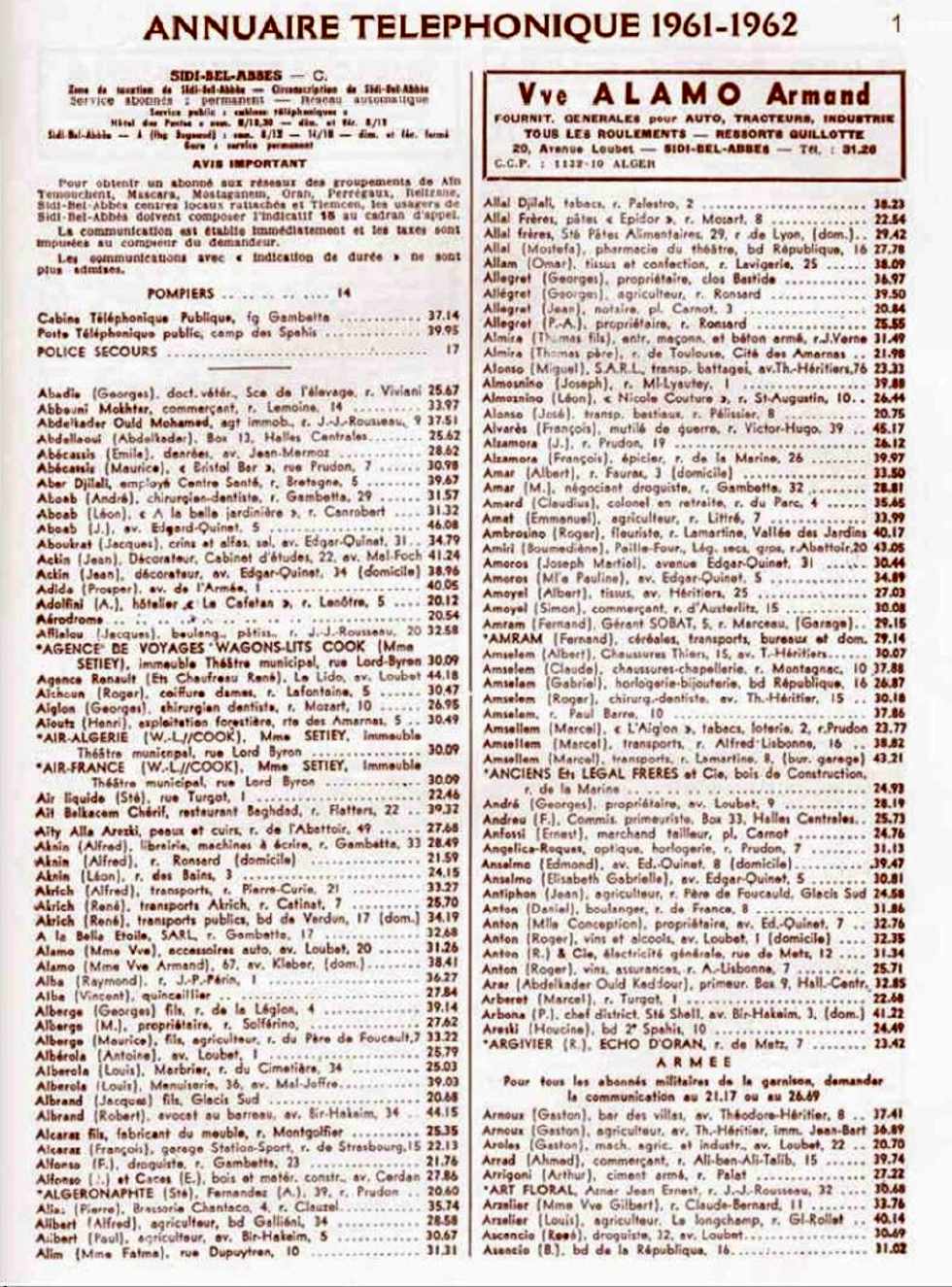 L'annuaire téléphonique de Sidi Bel Abbès de 1961-1962 est disponible pour tous ceux qui ont besoin de se rafraîchir la mémoire, de retrouver le nom ou le numéro d'une rue, de vérifier une adresse, de vérifier un nom ou un prénom,...