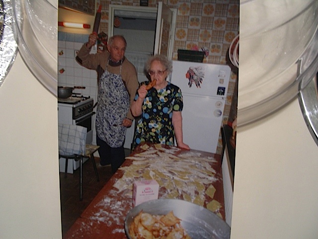 Parfois je me rappelle certains jeunes du quartier venaient et tu les embauchais pour pétrir la pâte, ensuite tu prenais des morceaux de pâte. Tu les allongeais, en forme de boudin, et tu les rejoignais pour former la couronne. Avec ta main tu étendais des œufs battus dessus, pour les dorer, et tu semais des grains d'anis de toutes les couleur, sur certaines tu mettais un œuf que tu faisais tenir avec deux petites bandes de pâte qui se croisaient, je me rappelle aussi que tu découpais aussi dans du carton des formes comme des poupées, des chevaux, des bateaux. Et tu étendais de la pâte et en plaçant les formes dessus, tu découpais autour avec un petit couteau, ces gâteaux là étaient pour nous les enfants, tu passais le reste de la journée à les cuire dans cette petite cuisinière à gaz toute simple que nous avions près du lavabo de la cuisine, et comme le four était petit tu ne pouvais en cuire qu’une à la fois, mais alors ça sentait bon, dans toute la maison, ça sentait la fleur d’oranger, et la vanille,et la farine, puis quand les couronnes sortaient du four,tu les alignaient les unes à coté des autre sur le comptoir, qui était en petits carreaux de céramique vert. Je me rappelle des fois certaines étaient un peu brûlées dessous, car ta cuisinière ce n’était pas comme les fours modernes d’aujourd’hui, mais ma belle maman tu faisais les meilleurs gâteaux du monde, et puis dans la soirée les voisins venaient voir tes couronnes, car oui c’était la coutume.