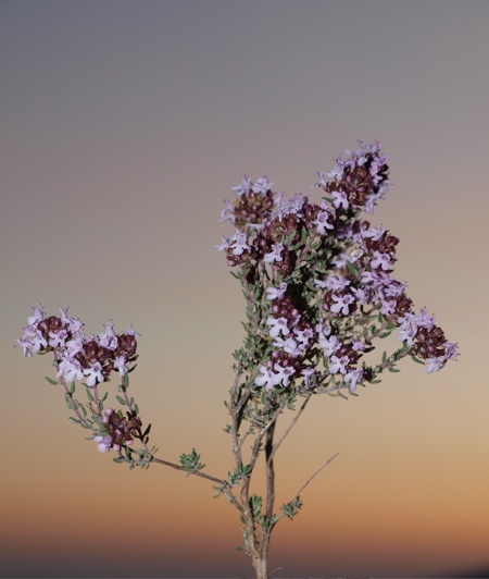 | Le thym pousse sur des terrains parfois très caillouteux. | Au mois de mars le thym commence à être en fleur dans le Sud de la France. |