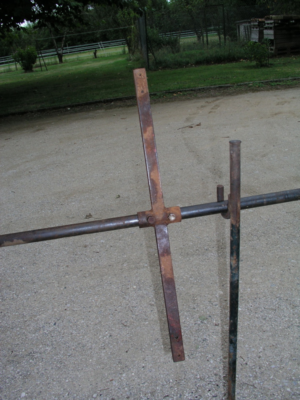 Supports: 2 barres en fer plein de 20 millimètres de diamètre et de 1.10 mètre (environ) comme support de broche qui seront plantées en terre. Appointez les bouts pour plus de facilité et souder à 15 ou 20 millimètre de haut un demi anneau de chaîne qui supportera la broche.