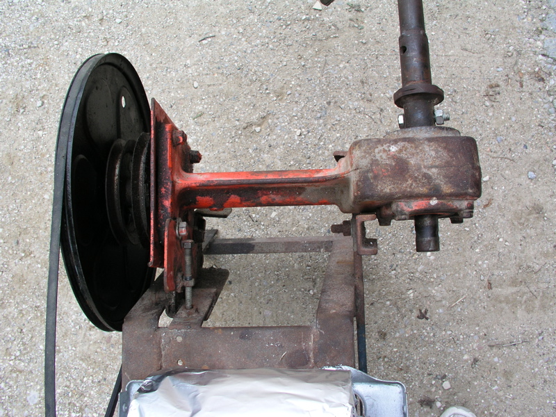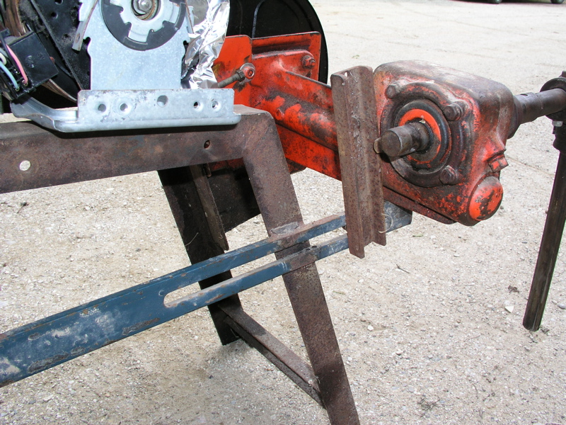 Sur l'avant du châssis vous fixez un support à l'aide de cornière ou autre à votre convenance qui soutiendra et alignera votre arbre de transmission. La largeur dépendra de l'épaisseur du carter de votre vis sans fin. Il s'agit uniquement de supporter le carter sans avoir à le brider, il sera donc démontable pour le transport.