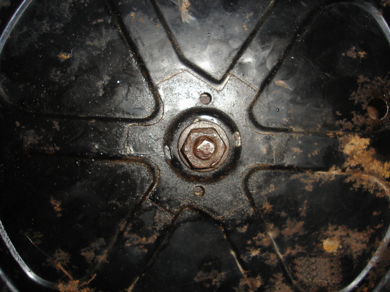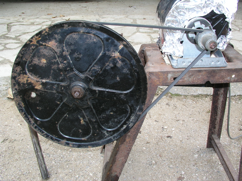 De l'autre coté, la poulie de la machine à laver, fixée par un écrou (écrou qui se trouve en bout d'arbre de votre transmission) sur l'axe de sortie de la vis sans fin.
