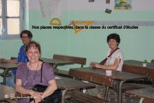 Alors je suis redescendue sur terre... Je me suis calmée et je suis allée à la rencontre de mon mari, je voulais qu'il me filme dans toutes les classes où j'étais passée, je me suis assise aux mêmes emplacements de mon enfance, les bureaux étaient toujours les mêmes, en bois tout délabrés maintenant, avec leur encrier, vide, mais dont le parfum de l'encre m'arrivait encore jusqu'aux narines, les mêmes graffitis, j'ai essayé de retrouver mon nom mais d'autres graffitis les avaient recouvert, j'ai appelé Thérèse et Chantal afin que nous fassions des photos ensemble et nous avons profité au maximum de ce bonheur qui nous a été donné. A ces instant précis, nous avions 10, 12, 14 ans... Notre joie, n'a pas échappé, aux personnes venues nous accompagner, nous avons remercié le gardien et nous sommes ressorties le coeur allégé. J'ai regardé derrière moi, j'ai revu la rue où habitait ma camarade Arabe qui a fait toute sa scolarité avec moi dans cette école, j'ai demandé à des personnes si elles habitaient dans le quartier et si éventuellement elles connaissaient Manouche!...