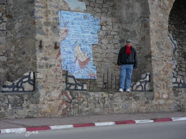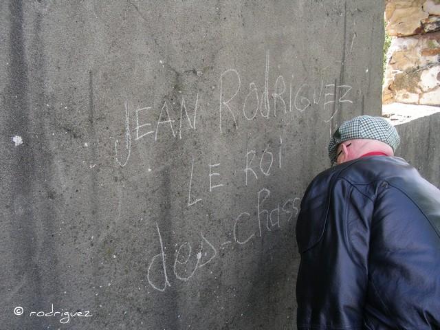 Il fait chaud, le soleil tape, il est 13 heure, je ramasse une pierre et sur un des murs dont le ciment est intact, j'inscrit "2010 Jean Rodriguez le roi des chasseur" voilà papa tu as repris possession de ton territoire de chasse, et je cherche un bel endroit pour ce que depuis 48 ans je n'ai cessé de penser que je ferai à Sididjemil. Trouver un endroit pour y mettre une photo de papa en chasseur prise à Sididjemil en 1960 et une paire de défenses de sangliers (voir mes photos), un des derniers qu'il à tué ici à Sididjemil, je soulève une grosse pierre mais un gros scorpion apparaît: non pas bon, je creuse avec mon ami le sol dur mais je ne suis pas convaincu, et puis je vois le mur d'enceinte côté nord qui est encore haut et bien conservé, je grimpe dessus et de là, je vois tout le bas de la montagne tout ce qui a retentit des coups de fusil de papa et je décide que ce sera là, juste en bas du mur dans ces grosses broussailles, ces broussailles où papa a si souvent rampé dedans pour tuer son sanglier au ferme, oui ce sera là.