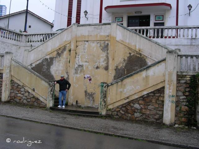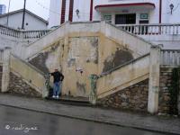 J'arrive à l'église St Thérèse, transformée en mosquée. Bien sûr ça fait un choc, je regarde je touche ses murs qui ont vu défiler tant de mariages. D'enterrement, de communiants, je me rappelle, les filles avaient des robes on aurait cru des mariés faut dire que nous les pieds noirs on était assez show times. La figure ont l'avait. Hein!!! Je monte les marches. Et je rencontre deux vendeurs de bonbons qui me disent vivre de cela. Quelle tristesse, ils sont adorables de gentillesse. Ils m'aident à prendre toutes les photos que je veux. On se parle, je leur raconte le temps glorieux de l'église St Thérèse. Et cette pluie qui ne lâche pas. Je gravis ses marches que je montais le jour de ma communion en 1960 avec mon beau costume et mon gros cierge, je pense à tous ces pas qui se sont inscrit sur ces marches, pas qui devaient être éternels mais qui ne furent que moments, dans le temps, je revois ce bon curé nous dicter son catéchisme et nous obliger à nous confesser de péchés que nous avions supposémment fait, alors je lui racontais n'importe quoi, que j'avais volé des carottes dans le champs de Mr Magro. Quels péchés ont a fait à dix ans! "Bon alors il me disait: tu diras pour ta pénitence, trois je vous salue Marie et quatre Notre père" ça peut bien m'avoir écoeuré de la religion et toutes ces grenouilles de bénitier qui je me rappelle étaient assises sur les bancs à prier avec leur missel et qui une fois sorties de l'église se mettaient à raconter tous et n'importe quoi sur le voisinage. Ah les commères!!!