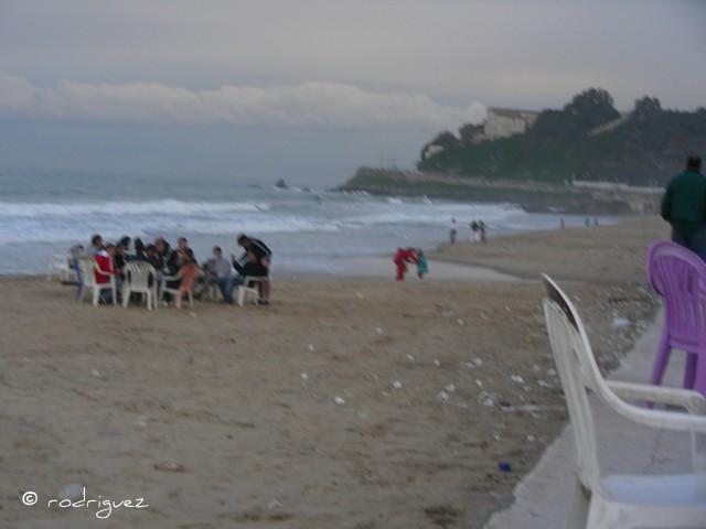 J'arrive à la plage de la caroube. Où grouillent nombres de restaurants, ça sent le BBQ à plein nez, ça sent les brochettes, le mouton, le poisson frit, le coumoun, aïe aïe. Oui je suis chez moi, nous rentrons dans un resto, là je me paye la traite, 12 merguez et 6 côtes d'agneau, plus la bonne galette arabe cuite sur la pierre plus les poivrons grillés concassés avec de l'huile d'olive, aïe aïe que c'est bon la bonne cuisine Algérienne. Seul bémol y a pas de vin faut boire du hammoud. Bon j'aime bien la limonade mais là là, il semble qu'un bon coup de Sidi Brahim ce serait génial, mais bon vas y du hammoud mon Gégé, je rentre à l'hôtel à pieds je veux goûter toute ma soirée je suis crevé, fatigué mais tellement comblé de bonheur que je ne dois pas perdre une miette de ma communion avec mon pays.