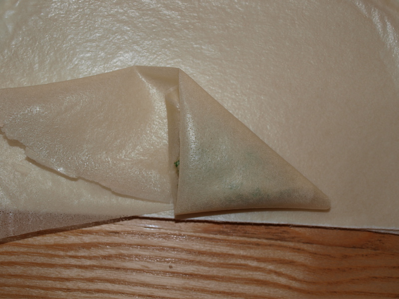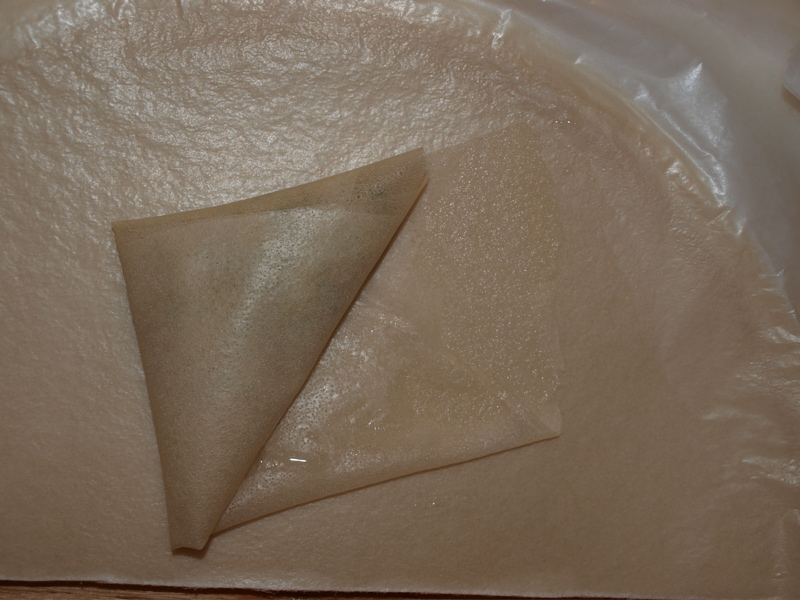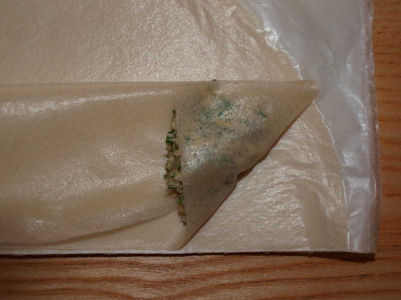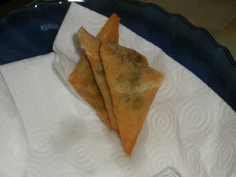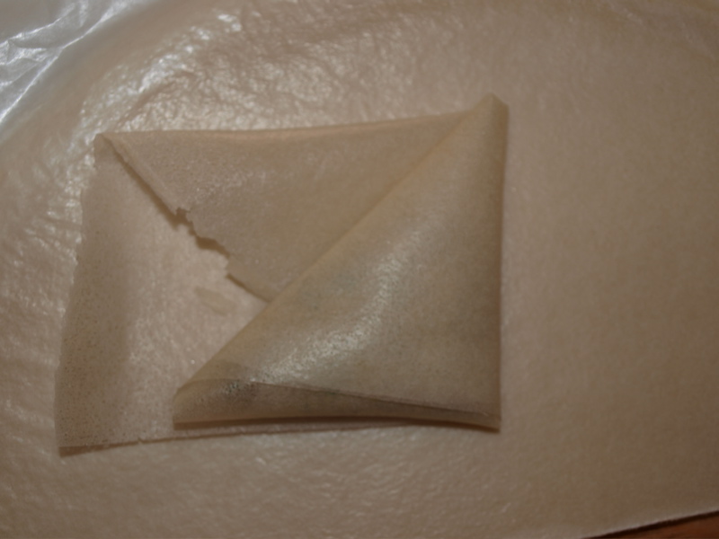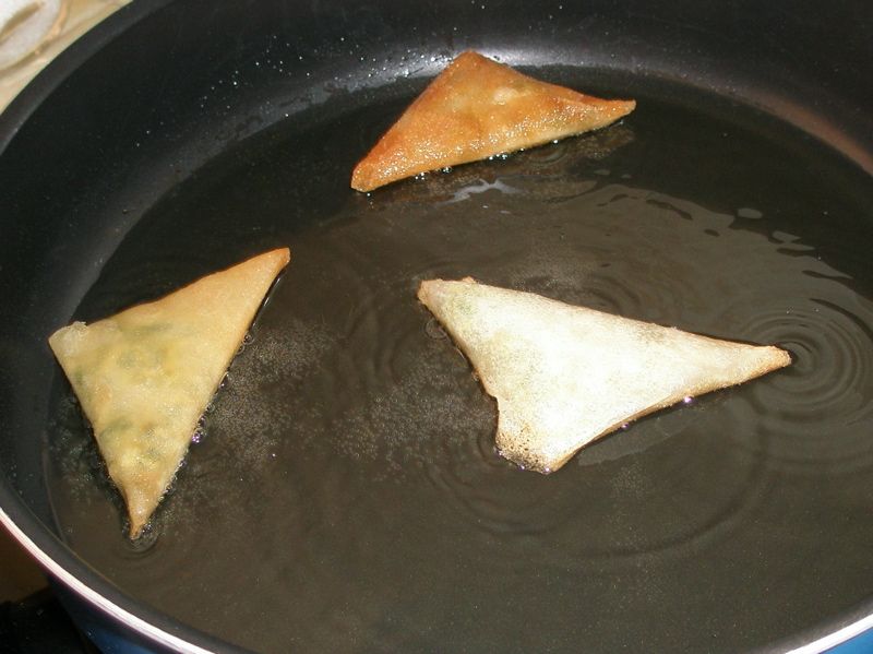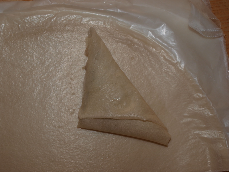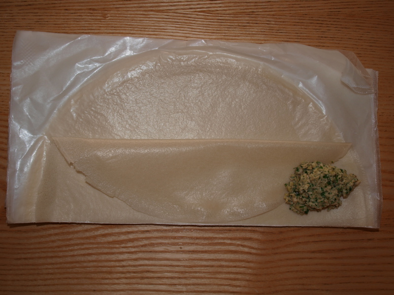 Disposez une cuillère de farce sur un coin d’une demi feuille de brick et plier (voir photos), soudez le bord et faites cuire à l’huile chaude.