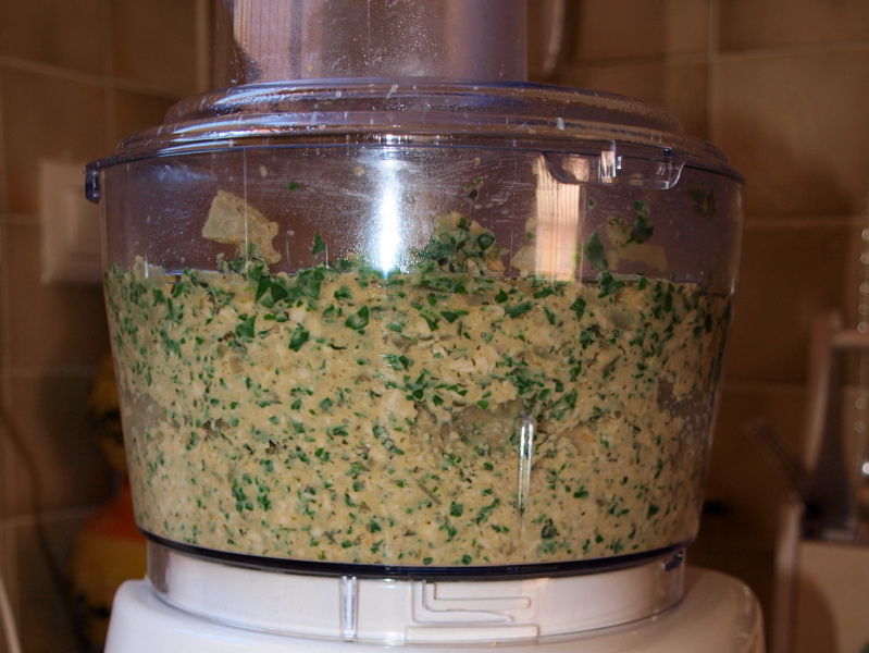 Dans un robot, mixer le tout pour obtenir une farce bien compacte.