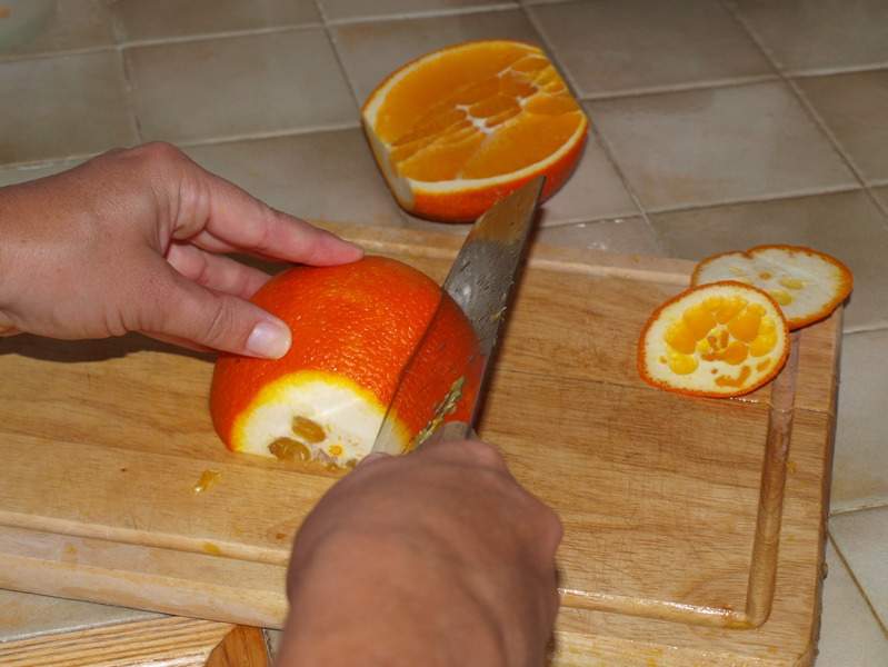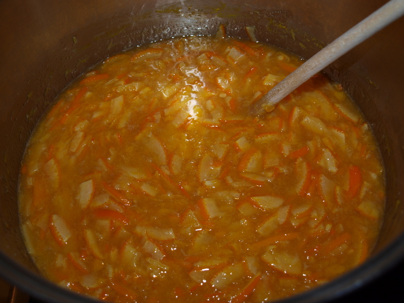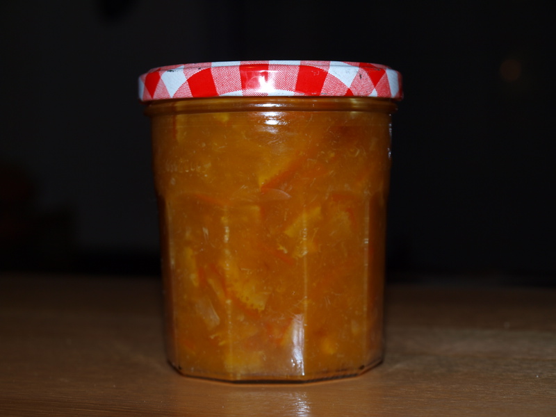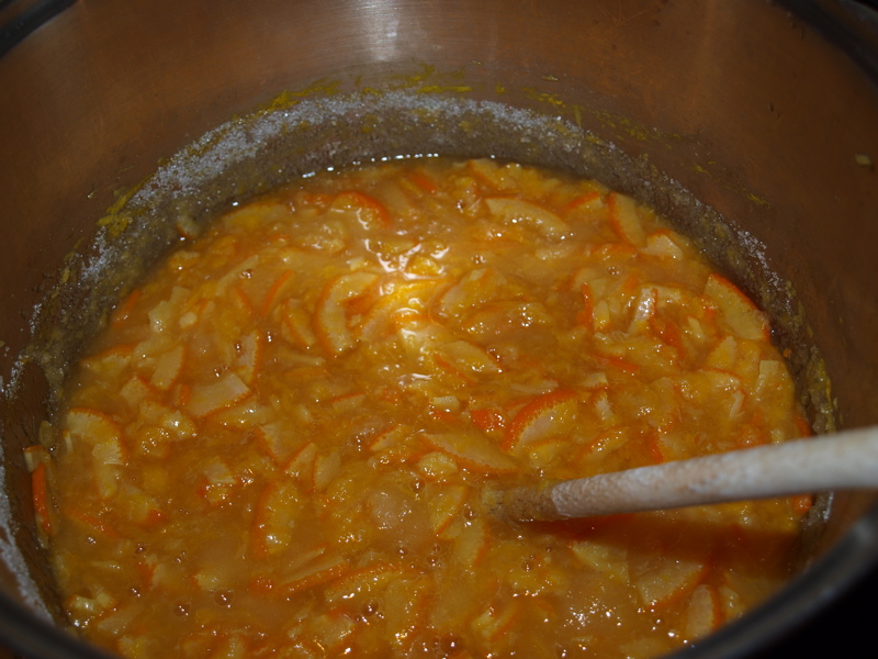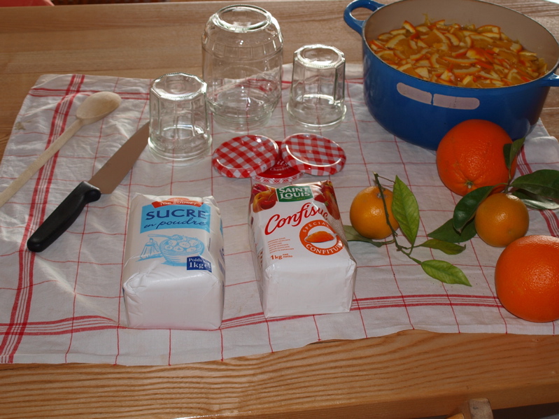 Ingrédients : 9 grosses oranges, 2kgs de sucre, le jus de 3 oranges (30 à 40 cl), et le jus d'1 à 2 oranges amères (10 cl).
