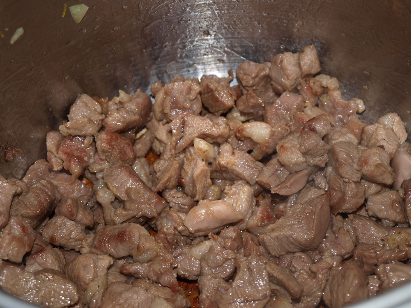 Une fois la viande dorée, ajouter 3 litres d'eau, saler, poivrer, ajouter du cumin et porter à ébullition.